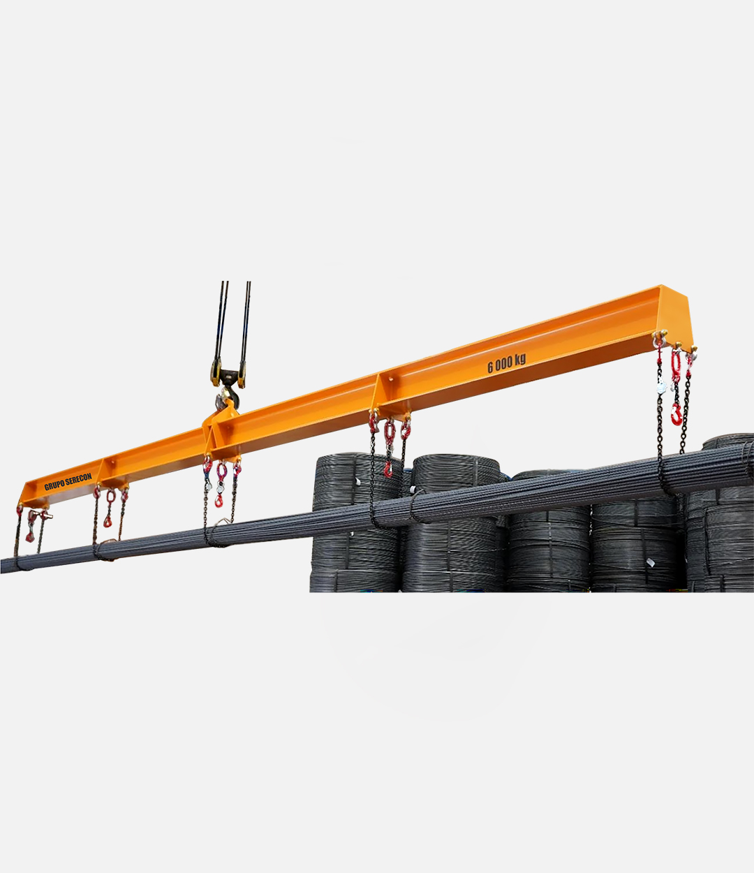 Balancín SERECON para elevación de cargas hasta 6000 kg, con 5 puntos de anclaje y cadenas de seguridad para izaje estable de paquetes de acero.