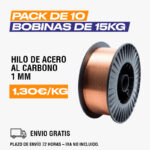 Pack de 10 bobinas de 15 Kg. de hilo de soldar acero al carbono de 1,0 mm. Peso total 150 Kg. Bobinas de plástico de diámetro 300. Aplicado en soldadura MIG MAG.